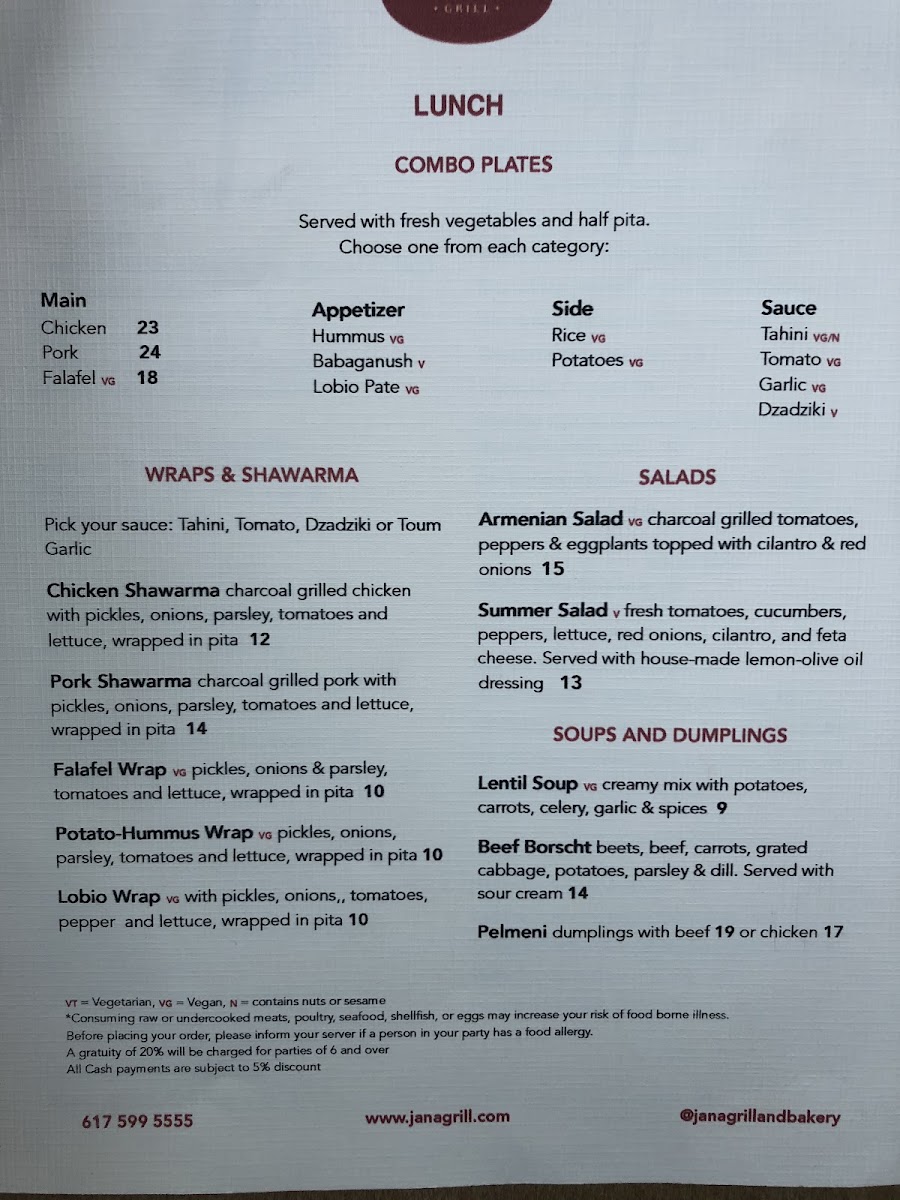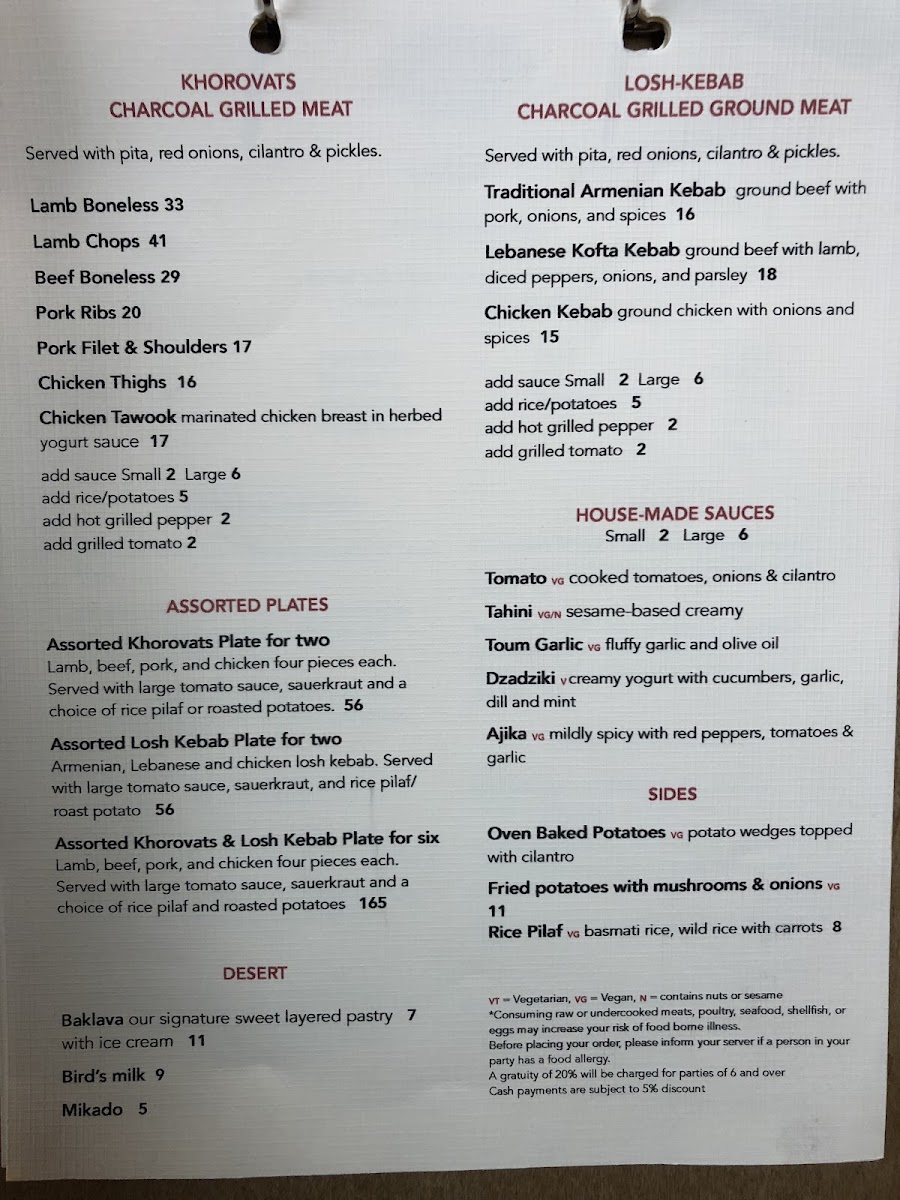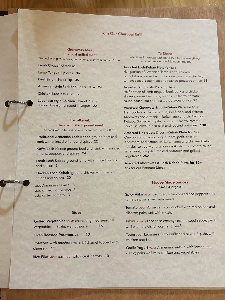 Full portions: lamb tongue, beef, pork, chicken Khorovats + Armenian, kofta, lamb & chicken Losh-Kebabs; pita, onions & cilantro; tomato sauce; sauerkraut; rice pilaf; roasted potatoes; grilled vegetables